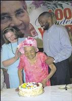 IN A ROOM filled with elegantly spread tables of bright yellow and warm candle centrepieces, many happy faces and colourful balloons, a humble Freida Theresa 'Granny' Riddell celebrated an early 100th birthday at the Hilton Hotel last Saturday.